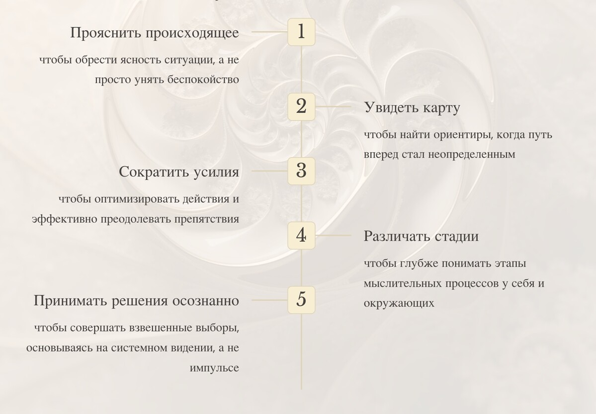 Сюда приходят не за мимолетным вдохновением и не за поверхностной мотивацией, обещающей быстрые решения. Наша аудитория, опытные профессионалы, ищет нечто гораздо глубже: осмысление, ясность и системное понимание. Это пространство для тех, кто готов к вдумчивому поиску ответов, которые позволят действовать осознанно и с большей опорой на себя.